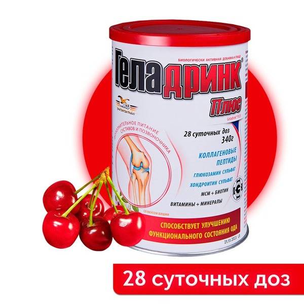 Keywords: Geladrink Plus, joint pain relief, spine health, collagen supplement, glucosamine chondroitin, MSM, joint regeneration, cartilage health, bone health, connective tissue, cherry flavor, musculoskeletal health, vitamin C, biotin, vitamin B6, calcium, magnesium, manganese, copper, 340g, powder supplement, Gelita collagen, pain relief, mobility improvement, antioxidant.
