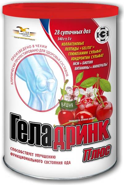 Description: Geladrink Plus is a comprehensive joint and spine support supplement formulated to promote active tissue nutrition and enhance quality of life for those with musculoskeletal conditions. This delicious cherry-flavored powder helps improve the condition of skin, hair, and nails. Each 12g daily serving contains: 9500mg Collagen Hydrolysate, 200mg Glucosamine Sulfate, 100mg Chondroitin Sulfate, 100mg MSM (Methylsulfonylmethane), 60mg Vitamin C, 1mg Vitamin B6, 300mcg Biotin, 1mg Manganese, 80mg Calcium, 30mg Magnesium, and 1mg Copper.
