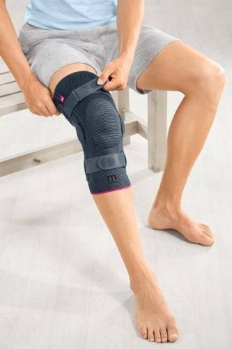 Following lateral ligament or meniscus injuries, or other knee conditions, stabilization is crucial for both conservative and post-operative treatment. The Genumedi pro semi-rigid knee brace provides this support, even during physical activity, thanks to its stabilizing side supports. The Easyglide polycentric hinge mimics the knee's natural biomechanics (simultaneous rotation and gliding), ensuring a perfect fit during movement. The knitted compression sleeve improves blood circulation and tissue nutrition, reducing swelling and pain. Uniquely, the Genumedi design minimizes patellar pressure even when bending the knee, thanks to the strategically placed silicone ring, preventing patellofemoral pain syndrome. Its breathable fabric efficiently wicks away moisture, maintaining optimal skin temperature year-round. The specialized knitting technique, including the popliteal fossa area, ensures a perfect fit and optimal compression. Its stylish design complements any outfit. High elasticity allows for unrestricted knee movement, while silicone dots and two circular straps prevent slippage, even during intense activity. Fabric composition: polyamide, polyester, elastane, viscose.