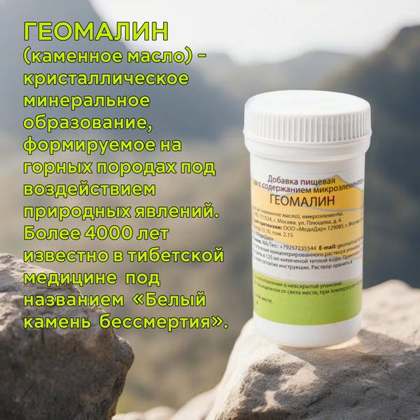Geomalin (Stone Oil, Brakhsun, White Mumijo) normalizes metabolic processes, enhances the functional activity of connective tissue, cleanses and tones the body, and prolongs physiological and sexual activity. It is recommended as a general tonic, prophylactic, cleansing, and immunomodulating agent.
