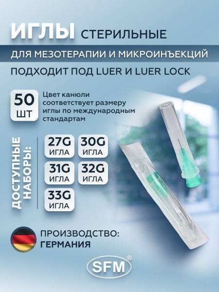 mesotherapy needles, microinjection needles, 32G needles, 0.23mm needles, 13mm needles, sterile needles, cannula needles, single-use needles, disposable needles, SFM, SFM Hospital Products GmbH, Germany, medical needles, ETW needles, silicone coated needles, laser-sharpened needles, Luer, Luer-Lok, painless injections, cosmetics needles, aesthetic medicine, professional needles, high quality needles, bulk needles, 50 pack needles, green needles.