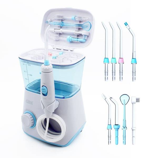 oral irrigator, water flosser, GESS Aqua Pro, GESS-707, dental irrigator, plaque removal, periodontal cleaning, orthodontic cleaning, rotating nozzle, 8 nozzles, 10 pressure settings, 600ml reservoir, dental hygiene, home dental care, professional dental cleaning, dentists recommended, stationary irrigator, auto-timer, suction cups, 12-month warranty.