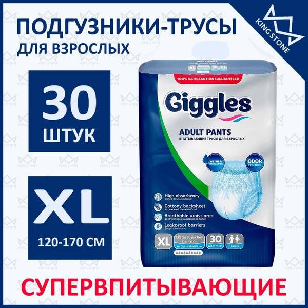 Experience superior comfort and protection with Giggles Adult Diaper Underwear, XL (30 count). These high-quality, absorbent briefs are manufactured in Turkey using premium materials sourced from the USA and Germany. Designed for moderate incontinence, Giggles underwear provides reliable leak protection without sacrificing comfort or mobility. Perfect for active individuals and those undergoing physical rehabilitation, these soft, elastic briefs are easy to put on and off like regular underwear, simply by tearing the side seams.