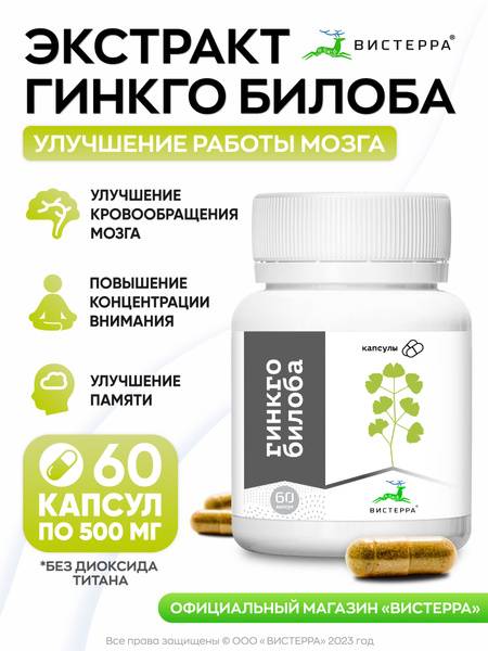 Visterra's Ginkgo Biloba capsules, developed by Tomsk scientists, offer potent support for brain function. Uniquely rich in terpene trilactones, not found in other plants, Ginkgo Biloba also boasts a wealth of organic acids, polysaccharides, essential oils, phosphorus, tannins, calcium, manganese, iron, selenium, and other beneficial components.