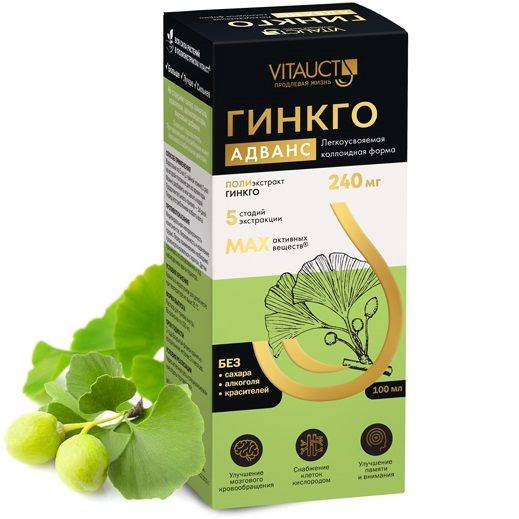 Ginkgo Biloba Advance also enhances concentration, increases productivity, reduces fatigue, distractibility, nervousness, and depression; relieves associated headaches; protects brain cells from toxins; safeguards against stroke; prevents thrombus formation; lowers the likelihood of hypertension; and restores impaired brain function. Its ability to normalize vascular, rheological, metabolic, and immunological functions makes it beneficial for conditions like Raynaud's syndrome and peripheral circulatory disorders. The biologically active substances in Ginkgo Biloba slow down the aging process, boosting physical activity and working capacity. The plant's enzymes protect against oxygen radicals, providing a strong antioxidant effect. This deactivates free radicals, affects the production of vasoactive mediators and inflammatory mediators, improving blood circulation and providing anti-inflammatory action.