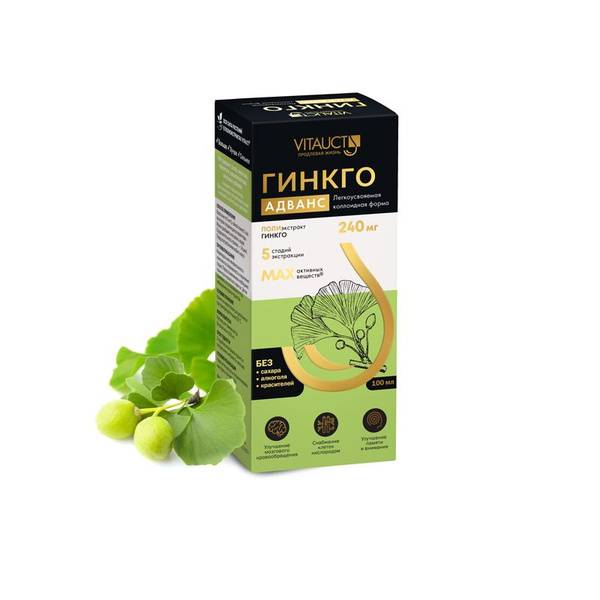 Keywords: Ginkgo Biloba, Ginkgo Advance, VITAUCT, brain health, memory improvement, cognitive enhancement, focus, concentration, Glycine, nootropic, antioxidant, neurotransmitter, blood flow, cerebral blood flow, hypertension, stroke prevention, anxiety relief, fatigue reduction, sugar-free, diabetes-friendly, Russia, industrial-scale cultivation, liquid poly-extract.