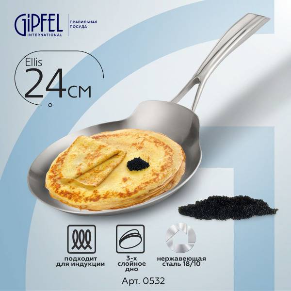 The Gipfel Ellis 0532 24cm crepe pan is designed for perfect pancake and crepe making. Crafted from high-quality 18/10 stainless steel, its tri-ply base ensures even heating and rapid cooking. The 24cm diameter cooking surface provides ample space, while the 19cm base diameter optimizes heat distribution for consistent results. Experience professional-level crepe preparation in your own kitchen.