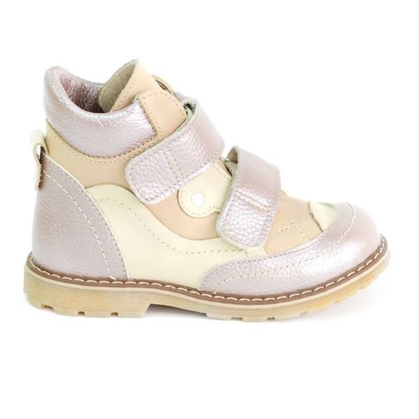 The Ortokuban-Yug M-5503B girls' demi-season orthopedic boots offer a stylish and practical solution for protecting developing feet. Crafted from premium natural leather, these boots ensure durability, comfort, and a sophisticated look. A soft, warm fleece lining keeps little feet cozy during spring and autumn, preventing chilling. The elegant pink and beige color combination appeals to young fashionistas, while dual Velcro straps provide easy on/off and a secure fit, perfect for active girls.