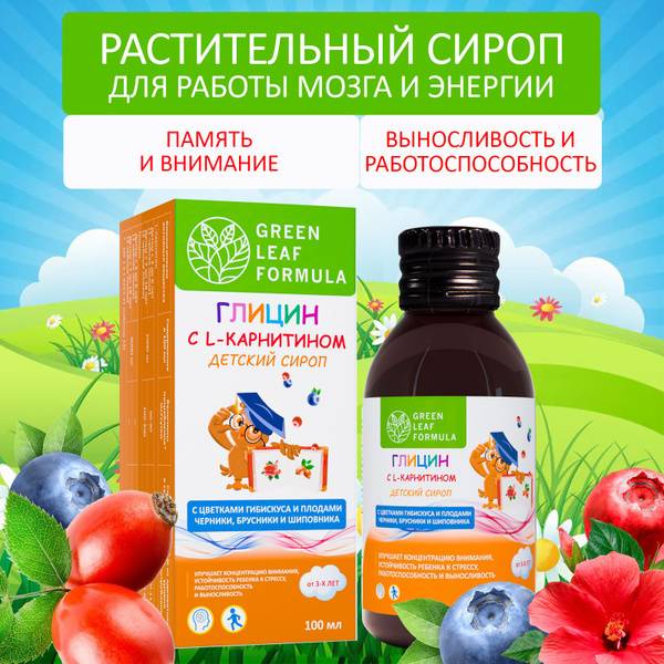 Glycine, L-Carnitine, children's syrup, kids' health, brain health, focus, attention, memory, immunity, stress relief, anxiety relief, ADHD, natural supplement, herbal formula, Hibiscus, Hyssop, Bilberry, Peppermint, Cowberry, Rosehip, Green Leaf Formula, dietary supplement, no GMO, no soy, no gluten, Russia, Rosaccreditation, ISO 22000, GMP.