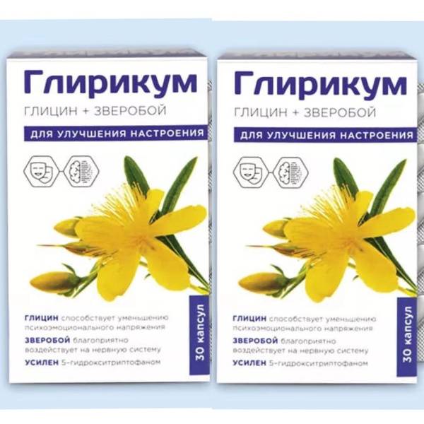 A dietary supplement providing glycine, flavonoids, and 5-hydroxytryptophan. Supports mood, sleep, and cognitive function. Contains Glyricum and St. John's Wort extract. Two convenient packs of 30 capsules each.