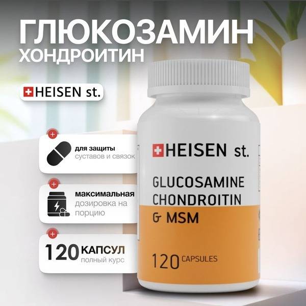 Glucosamine, Chondroitin, MSM, Hyaluronic Acid, joint pain, joint health, joint support, cartilage, connective tissue, supplement, dietary supplement, HEISEN, Switzerland, 120 capsules, arthritis, osteoarthritis, joint inflammation, mobility, flexibility, pain relief (joint pain), chondroprotective, MSM benefits, glucosamine benefits, chondroitin benefits, hyaluronic acid benefits.