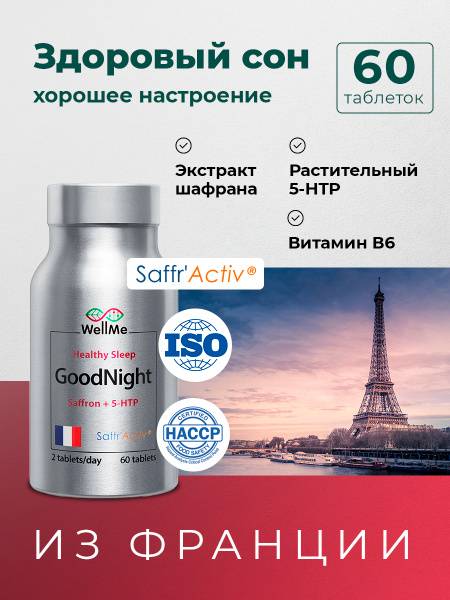 Description: Experience restful sleep and improved mood with WellMe GoodNight, a dietary supplement featuring a powerful blend of Saffron Extract (SaffrActiv), 5-HTP (from Griffonia seed extract), and Vitamin B6. Saffron's natural antidepressant properties promote REM sleep, alleviate mild depression symptoms, PMS, and sexual dysfunction, while also contributing to healthy cholesterol levels, weight management, and improved memory. 5-HTP, a potent natural precursor to serotonin and melatonin, boosts mood, sleep quality, and energy levels, and may reduce cravings for sugary and starchy foods associated with anxiety. Vitamin B6 supports emotional well-being and helps combat stress, nervousness, and insomnia. Take 2 tablets 30 minutes before bedtime for optimal results. 60 tablets per bottle.