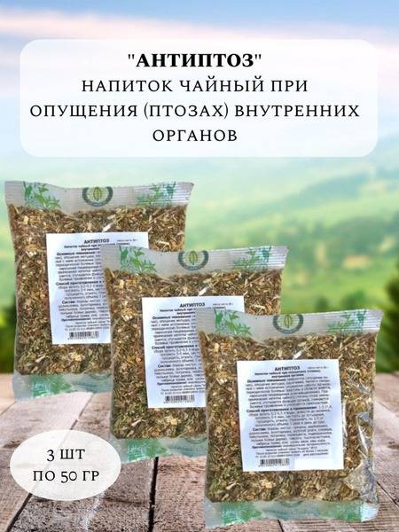 "description": "Gordeev Phytocenter's Antiptosis herbal blend supports organ function and overall well-being. Each package contains three 50g pouches of a carefully selected blend of birch leaves, clover, mugwort, and other herbs traditionally used to address nephroptosis (kidney prolapse) and visceral ptosis (organ prolapse). Simply boil with water, steep, strain, and enjoy 1/3 cup three times daily. Suitable for adults.",