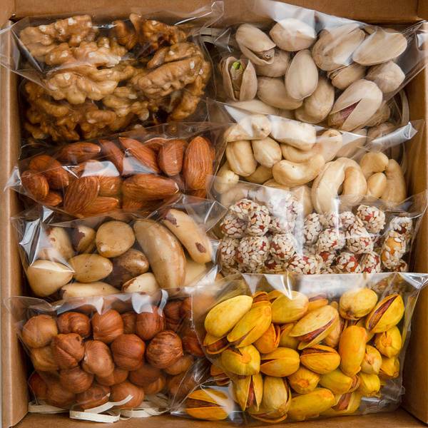 The decorative elements (filler, dried fruits, spices) may vary slightly depending on seasonal availability. For example, dried orange slices might be substituted with dried lemon slices. However, the delicious variety of premium nuts remains consistent. Order your "All Nuts Here" gift set today and spread some joy!