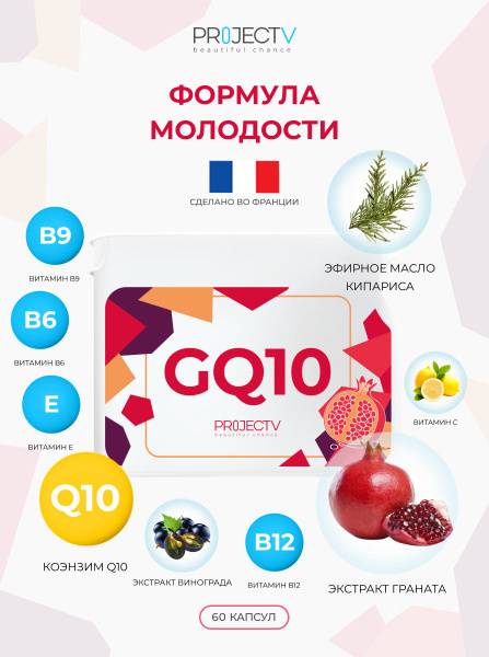 Keywords: GQ10, nutricosmetics, anti-aging, CoQ10, Coenzyme Q10, pomegranate extract, cypress oil, vitamin C, vitamin E, B vitamins, antioxidant, cellular energy, skin elasticity, cardiovascular health, youth serum, beauty supplement, anti-wrinkle, collagen production, free radical damage, fatigue, energy boost, 60 capsules.