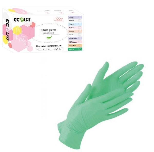 Description: EcoLat green nitrile gloves offer superior comfort and protection. These disposable, non-sterile, powder-free gloves are highly elastic, providing excellent tactile sensitivity. The hypoallergenic material is ideal for individuals with latex allergies. Suitable for a wide range of applications, including medical diagnostics, therapy, examinations, cosmetology, beauty industry, food processing, chemical manufacturing, microelectronics, and household use. Food-safe and highly rated for performance. (3.5 g/m² density in size M).