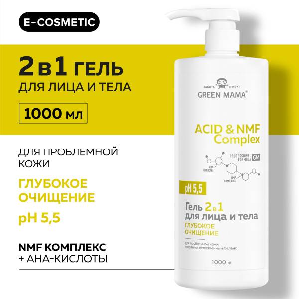 Officially from GREEN MAMA. This ACID & NMF COMPLEX cleansing gel is a powerful solution for acne-prone, hyperpigmented skin, and follicular keratosis. A blend of AHAs (Alpha Hydroxy Acids) effectively combats clogged pores on the face and body, smoothing skin texture and reducing the appearance of post-acne marks. Gentle surfactants cleanse without over-drying, while the NMF (Natural Moisturizing Factor) complex provides deep hydration and supports the skin's barrier function. Regular use reveals smoother, softer skin with an improved tone and texture. Suitable for daily use. The NMF acts as a physiological moisturizer, while lactic acid boosts hydration for enhanced elasticity and firmness, strengthening the skin barrier and reducing sensitivity. AHAs naturally exfoliate, promoting cell renewal, minimizing fine lines, and refining skin tone and texture. Experience visibly healthier, more radiant skin with GREEN MAMA.