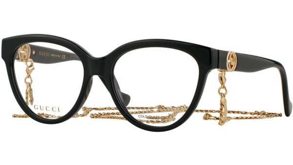 Elevate your style with the Gucci 1024O 006 cat-eye eyeglasses, a sophisticated frame crafted in Italy. These lightweight (31g with lenses) black acetate glasses feature a glamorous chain detail, embodying timeless Hollywood elegance. Inspired by iconic actresses like Grace Kelly, Elizabeth Taylor, and Audrey Hepburn, this versatile design complements various face shapes and outfits. The signature Gucci "G" logo adorns the temples, adding a touch of luxury. Includes a luxurious olive green velvet case, microfiber cleaning cloth, certificate of authenticity, and manufacturer's instructions. Enjoy the comfort and quality of individually adjustable temples and a 1-year warranty. 138mm width (temple to temple, inner measurement). Authentic Gucci eyewear from Kering Eyewear. Made in Italy.