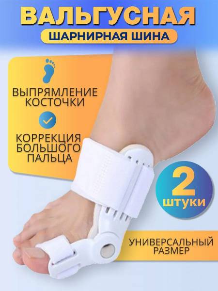 </section> <hr> <section>Correct hallux valgus and alleviate bunion pain with this orthopedic big toe splint. It effectively realigns the big toe, reducing inflammation and preventing recurrence. Wearable with loose shoes or barefoot. Our hinged bunion corrector provides a painless, non-surgical method for straightening the big toe and reducing bunion size. It relieves pressure, soothes pain, and improves comfort during daily activities. The splint secures the big toe anatomically, easing bunion pressure, inflammation, and toe crossing. Enjoy improved foot function, better posture, and pain-free walking. The adjustable hinge allows for gentle, personalized toe correction. Benefits include: improved foot flexibility, joint relief, restored toe mobility, better circulation, balanced foot loading, bunion pain elimination, shoe friction protection, proper toe support, and prevention of foot irritation. Made from durable, safe materials (thermoplastic, textile, latex). Features: Universal size (adjustable), for men and women, wear with loose shoes or barefoot, day/night use, easy to wear with Velcro straps, fits right or left foot, long-lasting. Color: White. Size: Universal. Contents: 2 splints. Instructions included.