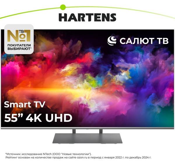 Experience breathtaking realism with the Hartens HTS-55UHDO11G-HC22 55" Ultra HD Smart TV. Its stunning 4K resolution reveals incredible detail and depth, while automatic contrast adjustment ensures vibrant, lifelike images in both bright and dark scenes. Enjoy seamless integration with your smart devices via Wi-Fi, mirroring content from your smartphone, tablet, or laptop onto the large screen. The integrated Saljut TV voice assistant lets you effortlessly search and play your favorite content with simple voice commands. Immerse yourself in rich, cinematic audio with Dolby Digital sound, creating an enveloping soundscape for a truly captivating viewing experience. With a wide viewing angle, everyone in the room enjoys a comfortable and exceptional picture from the 55-inch display. Upgrade your home entertainment with the Hartens HTS-55UHDO11G-HC22.