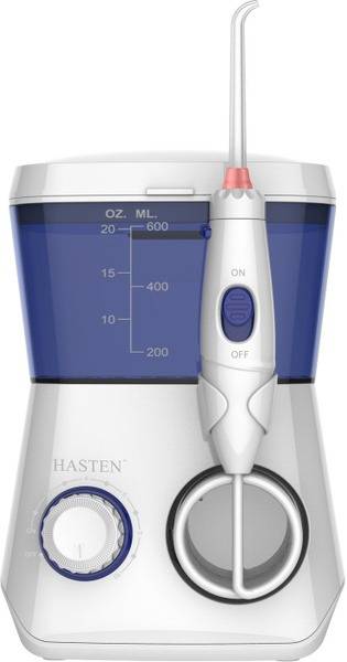 The HASTEN HAS830 is a powerful, family-sized oral irrigator designed for superior oral hygiene. Its large 600ml water reservoir, combined with 8 included nozzles (including a unique rotating nozzle), ensures thorough cleaning of teeth, gums, and hard-to-reach areas. This versatile irrigator is ideal for daily use, effectively cleaning around braces, implants, bridges, crowns, and other orthodontic appliances. The HAS830 features 10 adjustable pressure settings for customized cleaning, and its suction cups provide stable placement on any surface. A built-in 3-minute auto-shutoff timer helps manage cleaning time efficiently, allowing for thorough cleaning of both upper and lower teeth. The included three color-coded standard nozzles facilitate family sharing. The 360-degree nozzle rotation ensures complete access to all areas of the mouth for optimal cleaning. A premium travel case is included for convenient storage and portability. Experience the ultimate in oral care with the HASTEN HAS830.