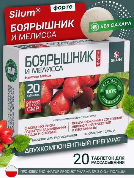 SEO Keywords: Silum, Hawthorn, Lemon Balm, Forte, Tablets, Cardiovascular Health, Heart Health, Blood Vessel Health, Nervous Tension, Insomnia, Sugar-Free, Dietary Supplement, Proanthocyanidins, Flavonoids, Essential Oils, Natural Remedy, Herbal Supplement, Melt-in-Mouth Tablets, 1100mg, 20 Tablets.