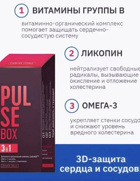 Three-tiered cardiovascular protection for modern life. Pulse Box supports cellular regeneration, lowers harmful cholesterol, and boosts antioxidant activity. This advanced formula helps normalize heart and vessel function, mitigating the negative effects of environmental factors and poor diet.