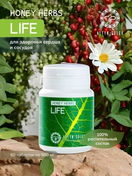 Honey Herbs Life, a 60-tablet herbal blend from Altyn Solok, offers comprehensive support for cardiovascular health. This natural formula works to normalize blood circulation, lower elevated blood pressure (hypertension), and cleanse the blood of excess cholesterol. It also aids in improving metabolism, enhancing memory, and reducing shortness of breath, particularly after physical exertion. Honey Herbs Life is a powerful heart health supplement and natural supplement for adults over 12.