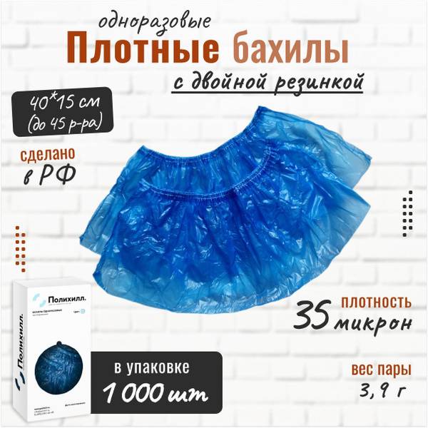 Polyhill offers heavy-duty disposable shoe covers, perfect for maintaining hygiene and cleanliness in a variety of settings. These durable, blue shoe covers are manufactured in Moscow using 100% Russian-sourced, primary low-density polyethylene (LDPE). Each cover boasts a robust 35-micron thickness and double reinforced elastic bands for superior comfort and longevity (lasting over 4 hours in dry conditions).