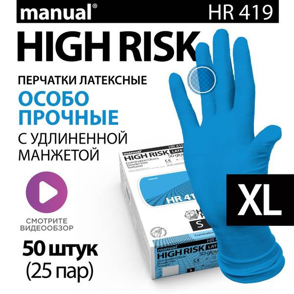 Protect your hands with MANUAL High Risk HR419 XL heavy-duty latex gloves. These extra-strong, powder-free gloves provide superior protection in demanding environments. Crafted from natural latex, they offer exceptional resistance to punctures, tears, and abrasions, exceeding expectations for durability.