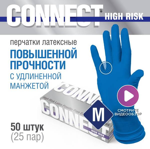 Protect your hands with CONNECT HIGH RISK heavy-duty, powder-free latex gloves. These size medium gloves (50 count) offer superior resistance to punctures and tears, providing high-level protection against aggressive chemicals. Their extended 290mm length safeguards your forearms, while textured fingertips and palms ensure a secure grip. Suitable for contact with weak acids and alkalis, as well as antiseptics. These gloves are food-safe certified, making them versatile for various applications.