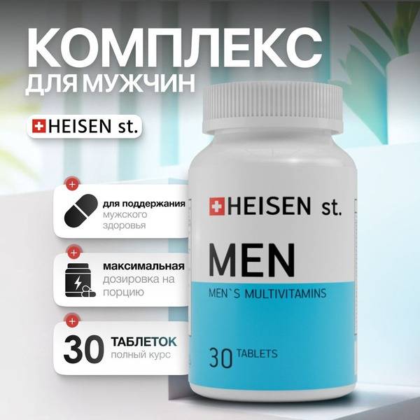 Heisen Men's Multivitamin is a premium Swiss-made supplement designed to support men's health and well-being. This comprehensive formula provides a potent blend of essential vitamins (A, C, D3, E, K1, B1, B2, B3, B5, B6, B7 (Biotin), B9 (Folic Acid), B12) and minerals (Iron, Zinc, Manganese, Molybdenum, Selenium, Chromium, Vanadium, Boron, Fluoride). Take one tablet daily for one month. Repeat as needed. Consult your doctor before use if you have any underlying health conditions or are taking other medications. Not suitable for individuals with allergies to any of the ingredients. Store in a cool, dry place away from direct sunlight, out of reach of children. Shelf life: 2 years.