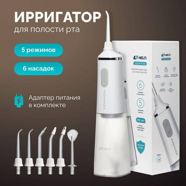 - HELTI H300 oral irrigator (ABS plastic), 300 mL tank, 5 modes, battery-powered with charger.