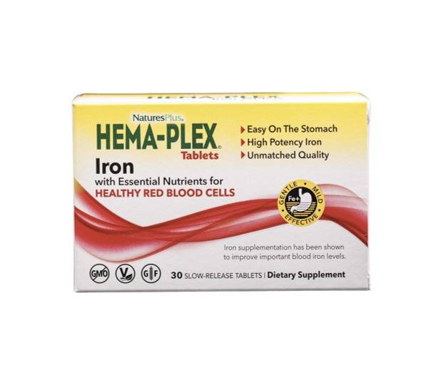 Keywords: Hema-Plex, Natures Plus, chelated iron, iron supplement, vitamin complex, anemia, iron deficiency, blood health, energy boost, immune support, B vitamins, vitamin C, vitamin E, folic acid, copper, long-release, 30 tablets, women's health, nutritional supplement.