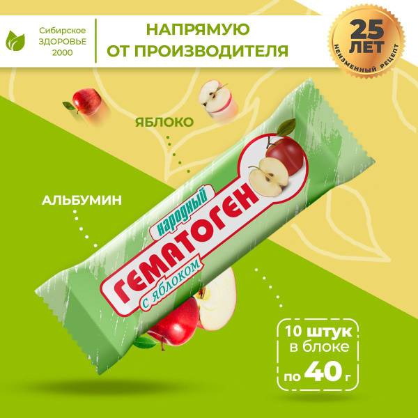 A delicious and convenient source of iron. Hematogen with Apple bars contain pieces of dried apple for a naturally sweet and fruity flavor. Each pack contains 10 bars, 40g each.