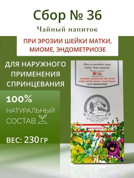 Herbal Remedy #36 for Cervical Erosion is a natural herbal tea meticulously crafted to support women's health. This unique blend of carefully selected herbs from the Caucasus Mountains helps address cervical erosion and inflammation, promoting wound healing. Known for their therapeutic properties, these herbs gently cleanse and soothe the intimate area when used in douches. The tea helps improve the overall condition of the pelvic organs, creating a comfortable environment for recovery. Its anti-inflammatory action is particularly beneficial for various gynecological issues. The natural ingredients help alleviate discomfort and support the body's natural healing processes. For optimal results, regular use is recommended. This herbal tea can be used as a standalone treatment or in conjunction with other therapeutic methods as part of a comprehensive approach to women's health. Herbal Remedy #36 is an excellent choice for those seeking a natural and effective solution to support their well-being. Choose safe, high-quality products for your comfort and health. Consult your doctor before use to determine any potential contraindications. Herbal Remedy #36: Your step towards confident, harmonious well-being.