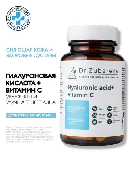 Dr. Zubareva’s Hyaluronic Acid with Vitamin C is a dietary supplement formulated to support skin hydration, joint comfort, and the health of hair and nails. Each capsule delivers 150 mg of hyaluronic acid combined with calcium ascorbate, a gentle source of vitamin C that aids absorption.