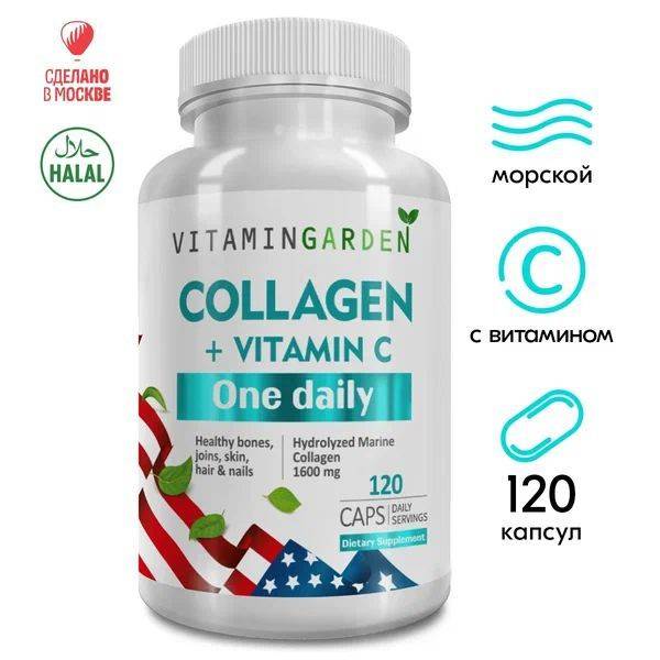 VITAMIN GARDEN Hydrolyzed Marine Collagen with Vitamin C Complex is an adult vitamin supplement formulated as capsules to support connective tissue, skin, hair, and nail integrity. The product combines hydrolyzed marine collagen with a multivitamin profile to serve as a supplemental source of nutrients involved in tissue maintenance and repair.