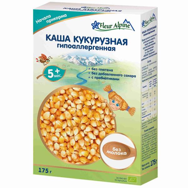 Fleur Alpine corn porridge is a dairy-free, gluten-free infant cereal formulated without added sugar and produced under organic standards. Prepared with care to preserve nutrients, it offers a naturally mild corn flavor and a light, airy texture when reconstituted.
