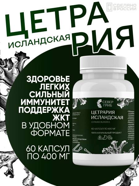 Description: Icelandic moss (Cetraria islandica) capsules offer natural respiratory support and immune system strengthening. Known for centuries for its medicinal properties, Icelandic moss is rich in beneficial polysaccharides, vitamins, and minerals. These capsules help alleviate cold and cough symptoms, protect mucous membranes, and promote overall well-being. The convenient capsule form ensures easy daily intake and optimal absorption of nutrients. Ideal for health-conscious individuals seeking natural support. Choose SeverGriba Icelandic Moss capsules for effective health boosting and seasonal illness protection.