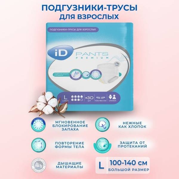adult diapers, adult diaper briefs, incontinence briefs, diaper pants, iD Pants Premium, size L, large, 100-140cm, 30 count, incontinence, absorbency, leak protection, breathable, comfortable, discreet, hypoallergenic, postpartum, menstrual, overnight protection, elderly care, medical, rehabilitation, mobility issues, unisex, affordable, premium quality, European brand, wetness indicator.