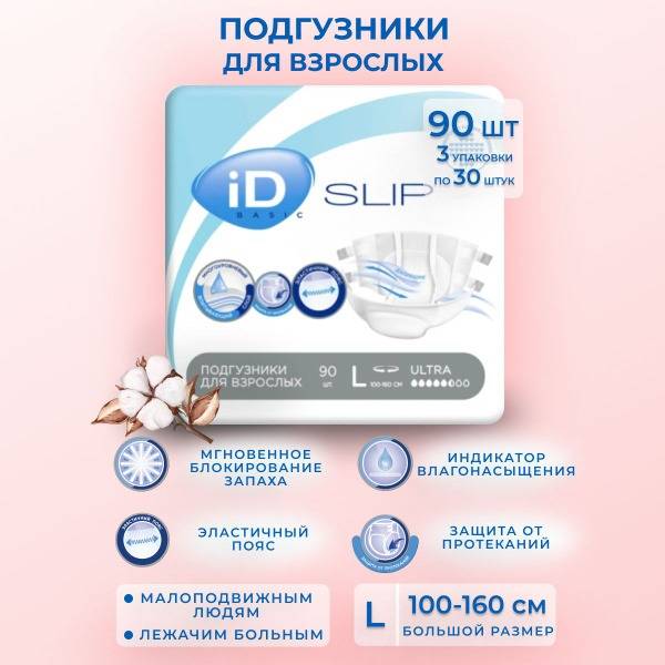 This bulk pack contains 90 iD Slip Basic adult diapers in size Large (L), conveniently divided into 3 packs of 30. Offering exceptional value, this cost-effective solution provides reliable protection for individuals experiencing light, moderate, or heavy urinary incontinence. Designed for a waist size of 100-160 cm, these diapers are suitable for men and women with limited mobility, elderly individuals, patients undergoing medical rehabilitation, and those confined to bed.