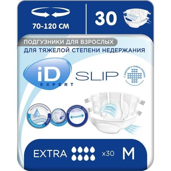 adult diapers, heavy incontinence diapers, adult diaper size M, iD SLIP EXPERT, incontinence supplies, bedridden care, elderly care, leak protection, absorbent diapers, reusable fasteners, dermatologically tested, overnight protection, comfort diapers, mobility issues, incontinence management.