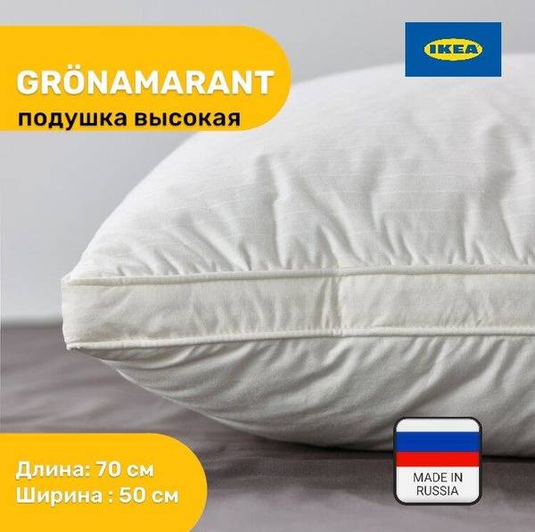 Experience the comfort of the IKEA GRONAMARANT high pillow (70x50 cm), now available directly from its Russian manufacturing partner. This 100% authentic pillow features a slightly modified size (previously 50x60 cm) due to IKEA's departure from the Russian market. Note the shortened IKEA label—a change implemented to avoid trademark infringement; compare it to your existing IKEA pillows. The pillow arrives compressed for shipping; fluff well to restore its volume. This high-loft pillow boasts a soft dobby cotton cover and a recycled material filling with strategically placed chambers. A firm core, enveloped in soft, fluffy fill, provides excellent support, alleviating neck and shoulder pressure for relaxed sleep. An internal pocket allows for fill adjustment, customizing support. Breathable cotton fabric promotes air circulation and moisture wicking for a dry, comfortable sleep. Ideal for back and side sleepers needing extra height. The included drawstring bag enables convenient storage and can even be reused. Machine washable at 60°C to kill dust mites. Designer: Maja Ganszyniec. IKEA Item Number: 204.604.11. Made in Russia by an IKEA supplier.