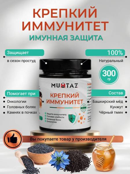 natural immune support, herbal blend, immune system booster, antiviral remedy, antifungal, antibacterial, black cumin seeds, sesame seeds, Bashkir honey, health restoration, detoxification, immune health, natural remedy, gift, strong immunity, MUMTAZ.