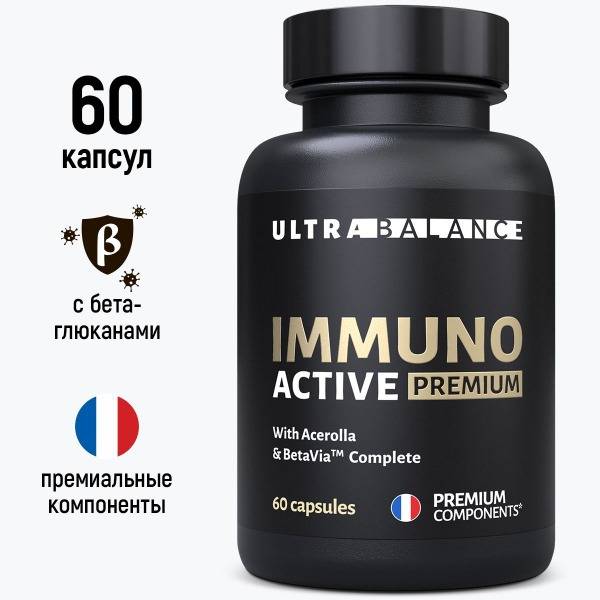 Boost your immunity with Immuno Active, a premium multivitamin complex from UltraBalance. This high-potency formula combines French-sourced vitamins and minerals, including BetaVia™ beta-glucans, patented forms of selenium and zinc, and BioPerine® black pepper extract for optimal absorption. Certified to GMP and ISO 22000 standards, Immuno Active supports a strong immune response, combats viral infections and colds, and provides antioxidant protection at the cellular level. It replenishes daily recommended levels of Vitamin C, Vitamin D, selenium, and zinc, combating fatigue and reducing the risk of inflammation. Ideal for adults seeking immune support year-round, especially during cold and flu season. 60 capsules per bottle. Contains no titanium dioxide, artificial colors, or flavors. Made with bovine gelatin. Register number: RU.77.99.11.003.R.003202.11.23. Marked with "Chestny Znak".