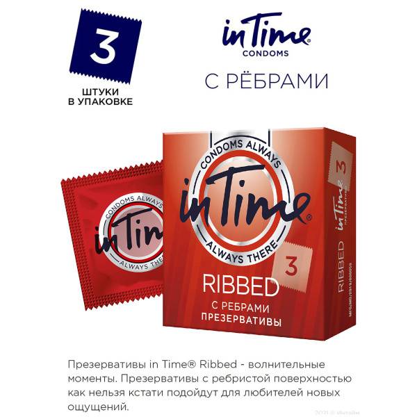 Description: Experience heightened pleasure with inTime Ribbed Condoms. The textured surface provides enhanced stimulation for both partners, while ensuring reliable protection and a safe sexual experience. These anatomically shaped, latex condoms are colorless and designed for single use.