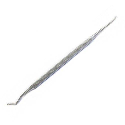 The RuNail Professional Ingrown Toenail Pusher is a dual-sided stainless steel tool designed for efficient treatment of ingrown toenails. One side features a fine rasp for carefully filing away the ingrown edge, while the other boasts a curved excavator tip for removing dead skin and gently packing antiseptic-soaked gauze under the problematic nail area. Trusted by professionals for its ease of use and effectiveness.