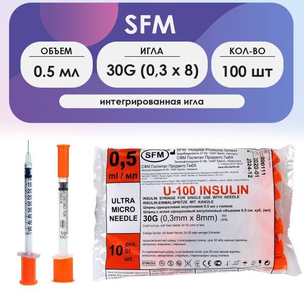 insulin syringe, 0.5ml syringe, U-100 syringe, 30G needle, insulin injection, disposable syringe, medical syringe, sterile syringe, three-part syringe, integrated needle, SFM syringe, German-made syringe, apyrogenic syringe, non-toxic syringe, ethylene oxide sterilization, painless injection, accurate dosing, 100 count, 0.30 x 8mm needle, diabetes supplies, diabetes care