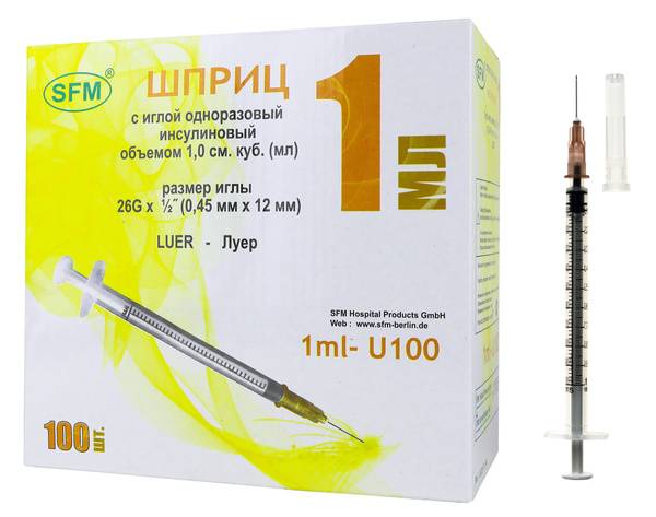 High-quality 1ml U-100 insulin syringes with attached 0.45 x 12mm (26G) needles, manufactured by SFM Hospital Products GmbH, Germany. Each syringe features: